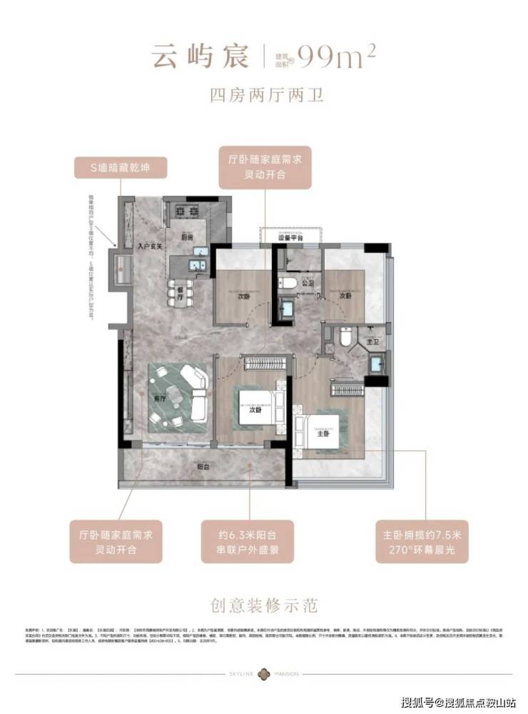 99㎡的4房2厅2卫,设计的是竖厅格局,客厅3.35米开间,LDKB一体化,S墙设计预留双开门冰箱卡槽位,三开间朝南,动静分区,分别做到了主卧15.26㎡/次卧9.57㎡/次卧6.96m²/次卧6.96㎡(包含墙体飘窗),U型厨房,公卫三段式干湿分离,赠送设备平台,得房率约79.5%(不含赠送),套内面积79.29㎡,客厅连接次卧出9.37m²大阳台西南或东南朝向。靓点:99平做到了4房2卫,主卧270°无柱转角飘窗,厨房烟道外置+额外赠送设备平台,并且是纯南向格局。