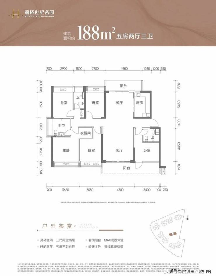 188㎡的5房2厅3卫:竖厅格局,南北通透双阳台,客厅4.3米开间,LDKB一体化设计,双主卧套间设计,5个卧室分别做到了3.65米/3.4米/3.05米/2.9米/2.7米的宽度,L型厨房带1个小生活阳台,公卫三段式分离,客厅阳台连接次卧出7.7米长的大阳台,主朝正南向。
