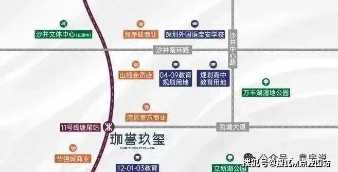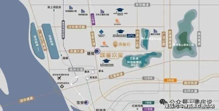 项目位于沙井新桥,珈誉府本身是一个大型综合体,自身配套丰富,自带50万㎡大型商业;地铁11号线塘尾站挨着项目,深圳外国语宝安学校在项目南北两侧,且靠近万丰湖、立新湖,有生态资源。
