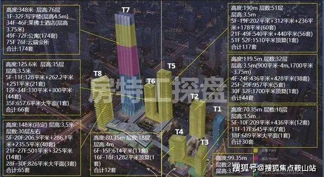 深圳湾一号总建筑面积47.5万㎡,由8座塔楼及1座商业建筑组成,分为南北两区,北区分为:T1写字楼、T2、T3、T4公寓;南区分为:T5、T6、T8公寓,T7为环球商务中心。