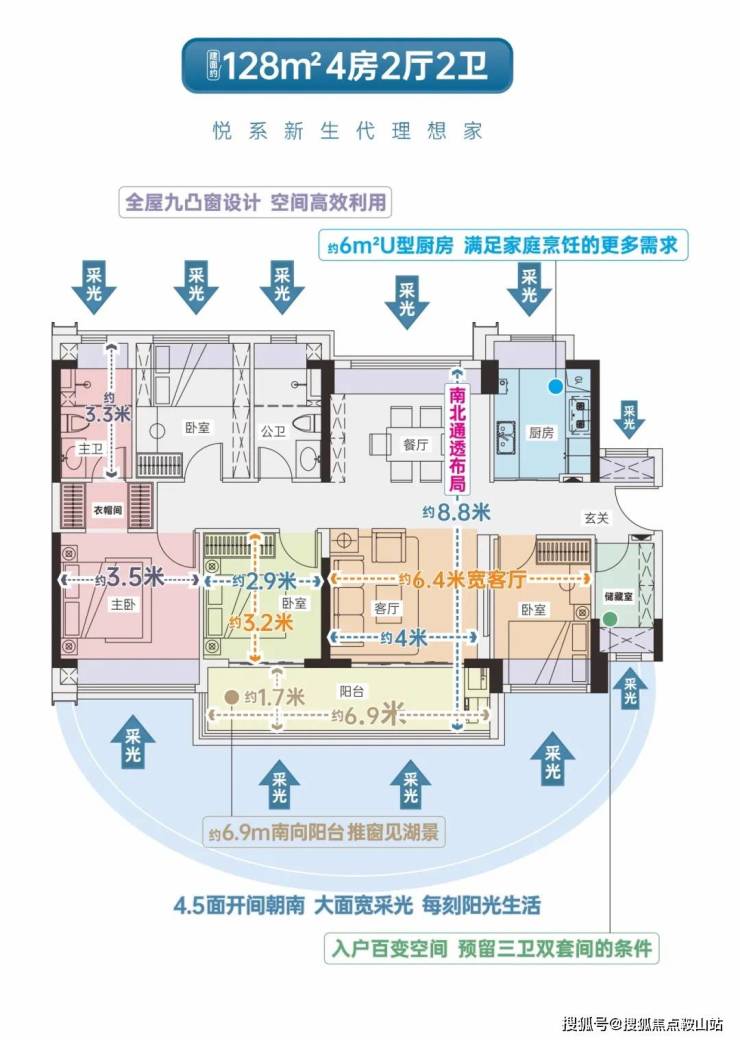 约128㎡四房两厅两卫•LDK大空间设计,南北通竖厅布局•6.9米阔景大阳台,视野开阔•入户灵动空间,满足个性需求•五开间朝南,全景自然风光