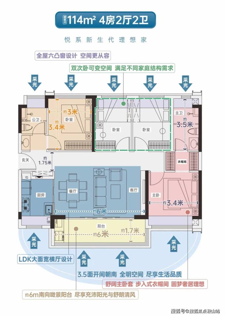 约114㎡四房两厅两卫•LDK宽横厅设计,双开间6米宽景阳台•全明方正空间,四开间采光通透对流•双次卧可变空间,满足家庭个性化需求