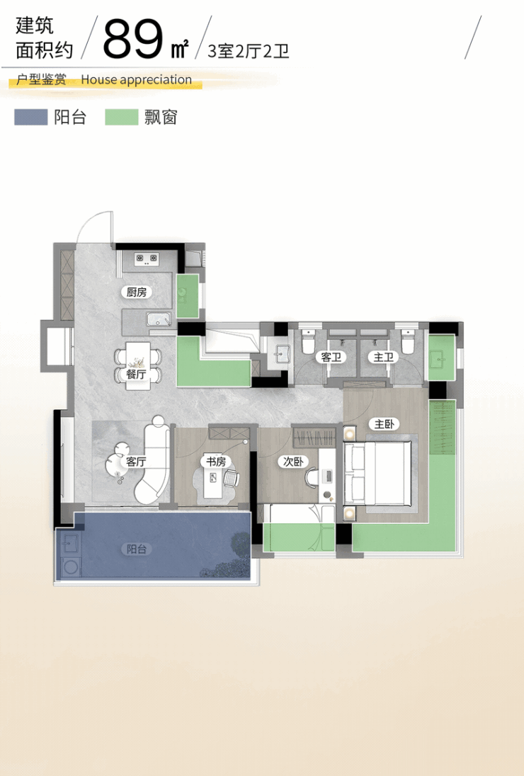 建面约89㎡三房两卫,直接一步到位。