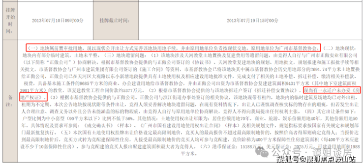 原来,这地块原用地单位为广州市基督教协会,招拍挂时地块仍涉及天河教堂土地置换及复建费用、带租约的临时建筑等遗留问题,且地块内尚有未办妥拆迁补偿协议也待协商解决。