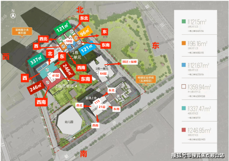 富通九曜公馆项目位于深圳市福田区新沙路18号,新沙路北侧,项目总占地面积16810.34㎡,建筑面积185533㎡,绿化率35%,容积率7.05,共4栋40-64层,总房源住宅285套,回迁房255套,保障房146套,公寓53套户,有1105个地下5层 上56/1049个车位,户型面积245-360㎡;"1单元2梯4户,2单元3~43层4梯6户,44~59层2梯2户 3单元22~40层2梯3户(22层以下回迁房)" 布局。