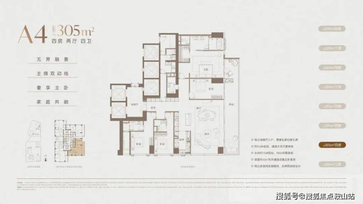 高区(42层起,150-200米):约370-403㎡,4+1房设计,配备家庭厅及家政套间;