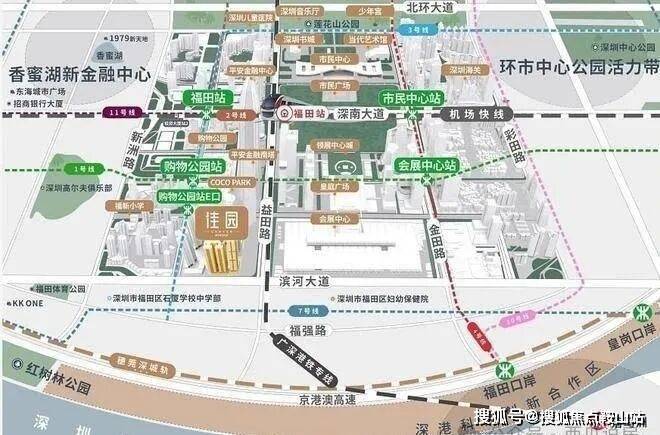 ◆ 7条地铁线环绕:1号线罗湖-机场、2号线莲塘-赤湾、3号线福保-双龙、4号线福田口岸-牛湖、7号线西丽湖-太安、10号线福田口岸-双拥街、11号线福田-碧头