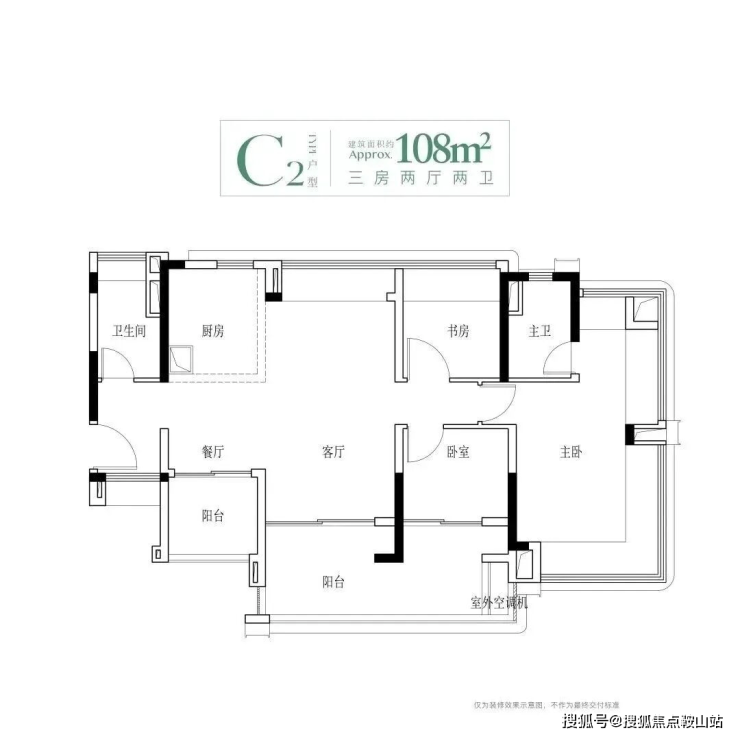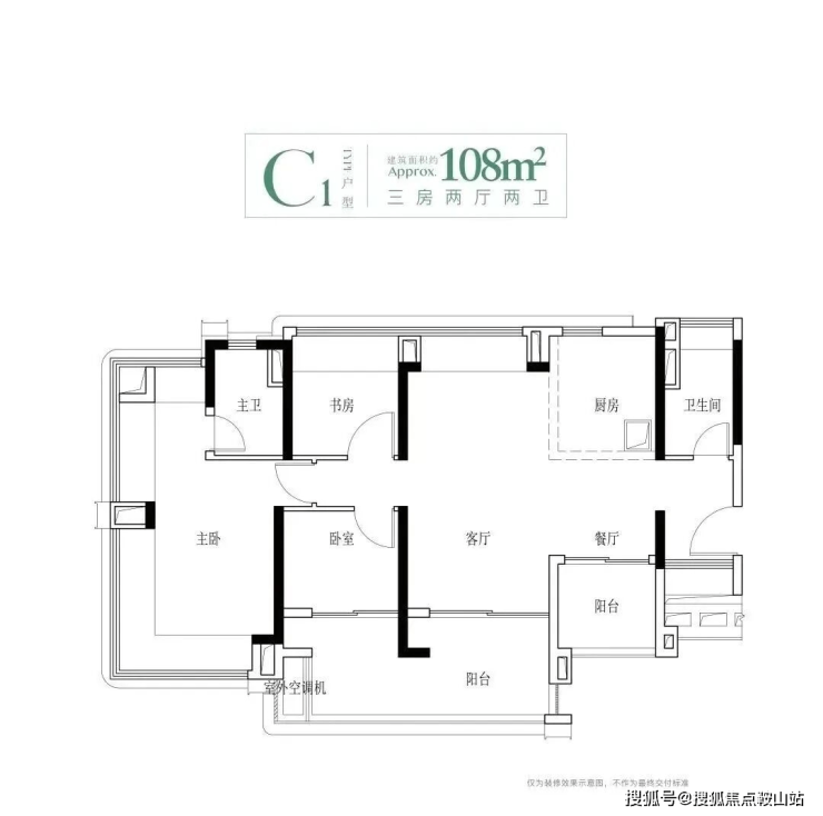 建面108平四房,该户型有三个面积段,都做到了南北对流设计,主要分布于1、2、4栋,1栋的108平会被前面的95方挡住一点视野,