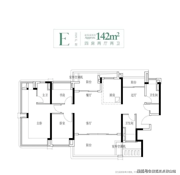 建面142平四房,同样是分布在4栋,南北对流双阳台设计,LDKB一体化大方厅,主卧还配建了独立衣帽间,使用面积完全不输160平以上的户型。