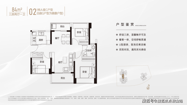 竖厅南北通透格局,客厅3.4米开间,客餐厅双阳台分离化设计,U型厨房,卫生间干湿分离,得房率约79%(不含赠送),客厅阳台主朝东北向。