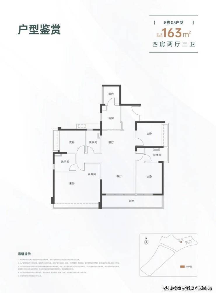 163㎡的4房2厅3卫,设计的是竖厅格局,一梯一户,进门入户玄关,LDKB一体化设计,三开间朝南,双主卧套房,客厅连接次卧出大阳台,L型厨房还带1个生活阳台,卫生间干湿分离,得房率约82%(不含赠送),东南朝向。