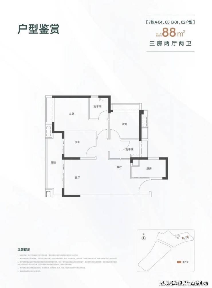 88㎡的3房2厅2卫,设计的是经典竖厅格局,进门入户玄关,LDKB一体化设计,动静分区,客厅连接次卧出大阳台,L型厨房,公卫三段式分离,得房率约82%(不含赠送),西南或东北朝向。