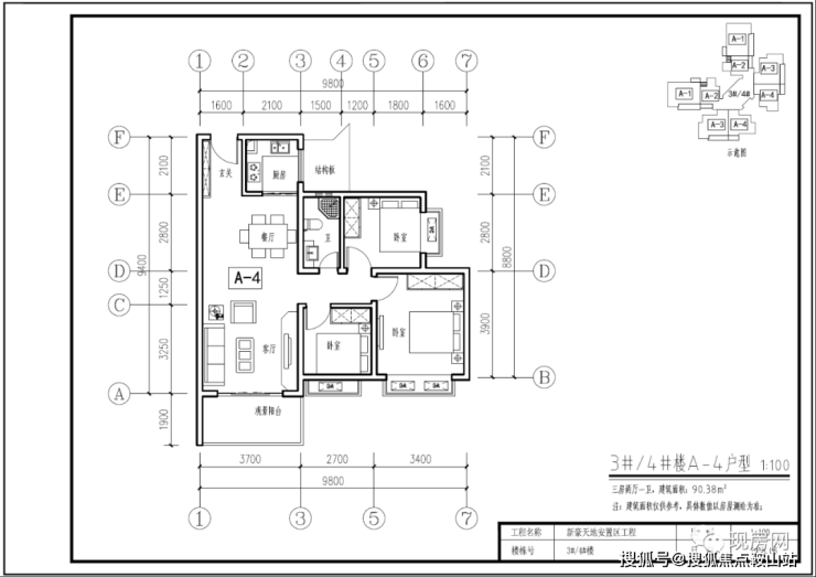 3#、4#号楼A4户型90.38㎡(三房两厅一卫)