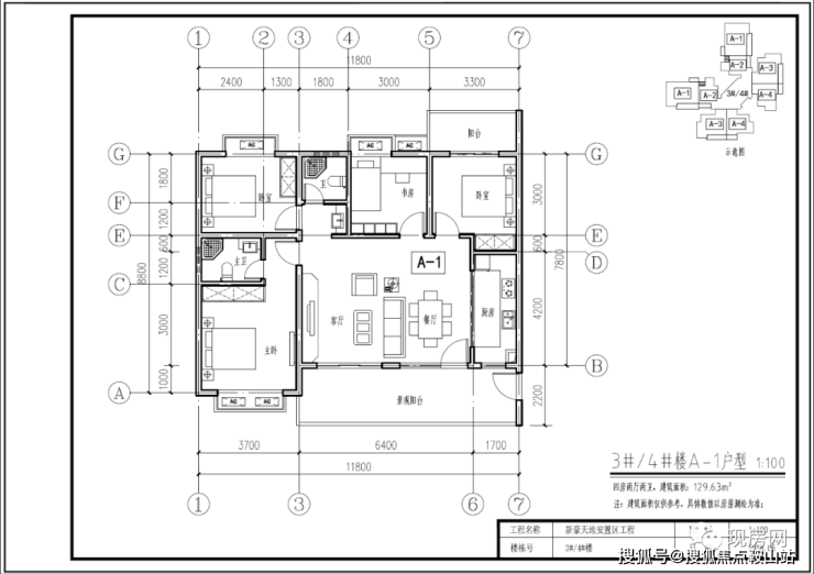 3#、4#号楼A1户型129.63㎡(四房两厅两卫)