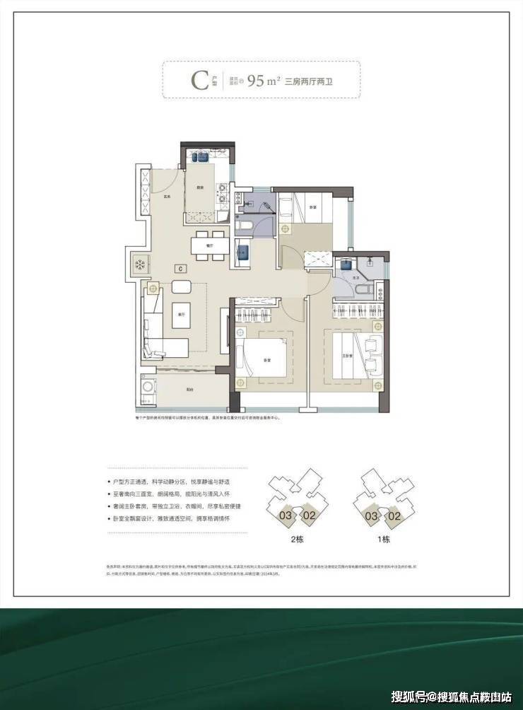 95㎡三房两卫:总价428万起,南北通透格局,四开间朝南,客厅开间3.6米,U型厨房,主卧套房设计,得房率79%。
