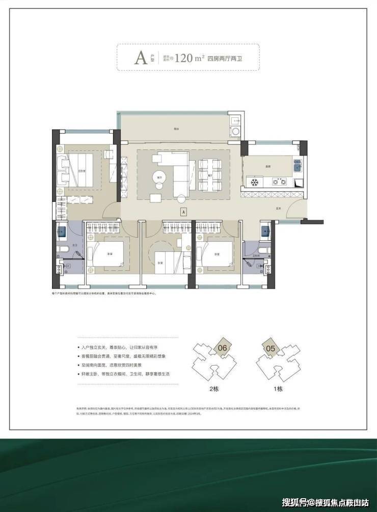 115㎡四房两卫:总价518万起,楼王级配置。横厅设计,客餐厅开间6.2米,南北双阳台,主卧20㎡套房带独立衣帽间,得房率80%。