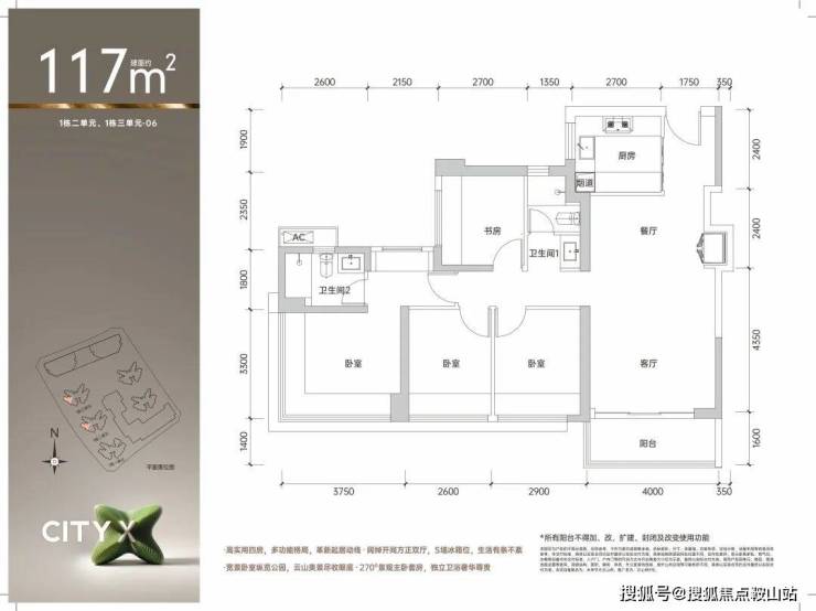 117㎡的4房2厅2卫,1栋2/3单元06户型,设计的是经典竖厅格局,进门入户玄关,客厅4米开间,LDKB一体化,S墙设计预留冰箱卡槽位,四开间朝南,动静分区,4个卧室分别做到了主卧16.5㎡/次卧9.57㎡/次卧8.58㎡/次卧7.97㎡(包含墙体飘窗),U型厨房,公卫三段式分离,得房率约90%(包含赠送) ,东南或西南朝向。