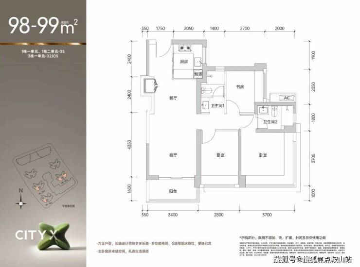 99㎡的3房2厅2卫,3栋1单元02/03/05/06户型,设计的是经典竖厅格局,进门入户玄关,客厅3.6米开间,LDKB一体化设计,S墙设计预留冰箱卡槽位,动静分区,3个卧室分别做到了主卧14.3㎡/次卧10.36㎡/次卧6.75㎡(包含墙体飘窗),U型厨房,公卫三段式分离,得房率约90%(包含赠送),东南或西南朝向。