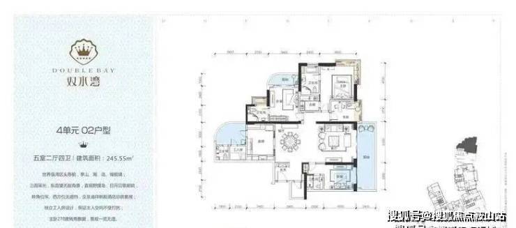 245.55㎡五室二厅四卫,三面采光,洋溢轩昂气度;主卧270度转角飘窗,观野狸岛、日月贝及无敌海景,饱揽城市繁盛;本项目臻品单位,海景资源值得一世珍藏;