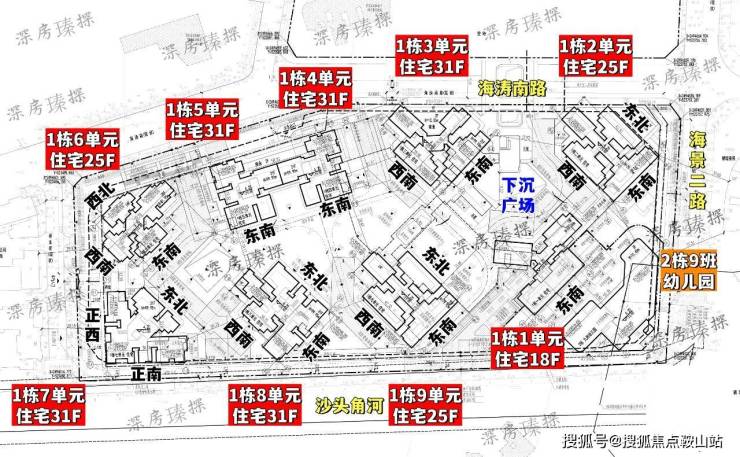 驭海隽府一期,总占地面积约3.01万㎡,总建筑面积约22.7万㎡,计容建筑面积约17.59万㎡,容积率5.27,绿化率40%,共由9栋18-31层高住宅组成,其中1栋1单元住宅18F,1栋2/6/9单元住宅25F,1栋3/4/5/7/8单元住宅31F,2栋是1所9班制幼儿园。