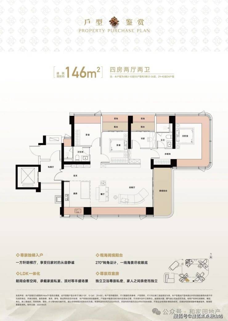将地标高度/创新设计/极致景观/自然融合四大要素集于一体,约150米地标建筑以45°错位转体设计,实现四户分踞四角的独立瞰景布局,每户均可享有极致山海景观。约55米超宽楼间距、0.6的黄金窗墙比远超常规住宅0.3-0.5的标准,呈现山景、海景、花园三重景观界面。