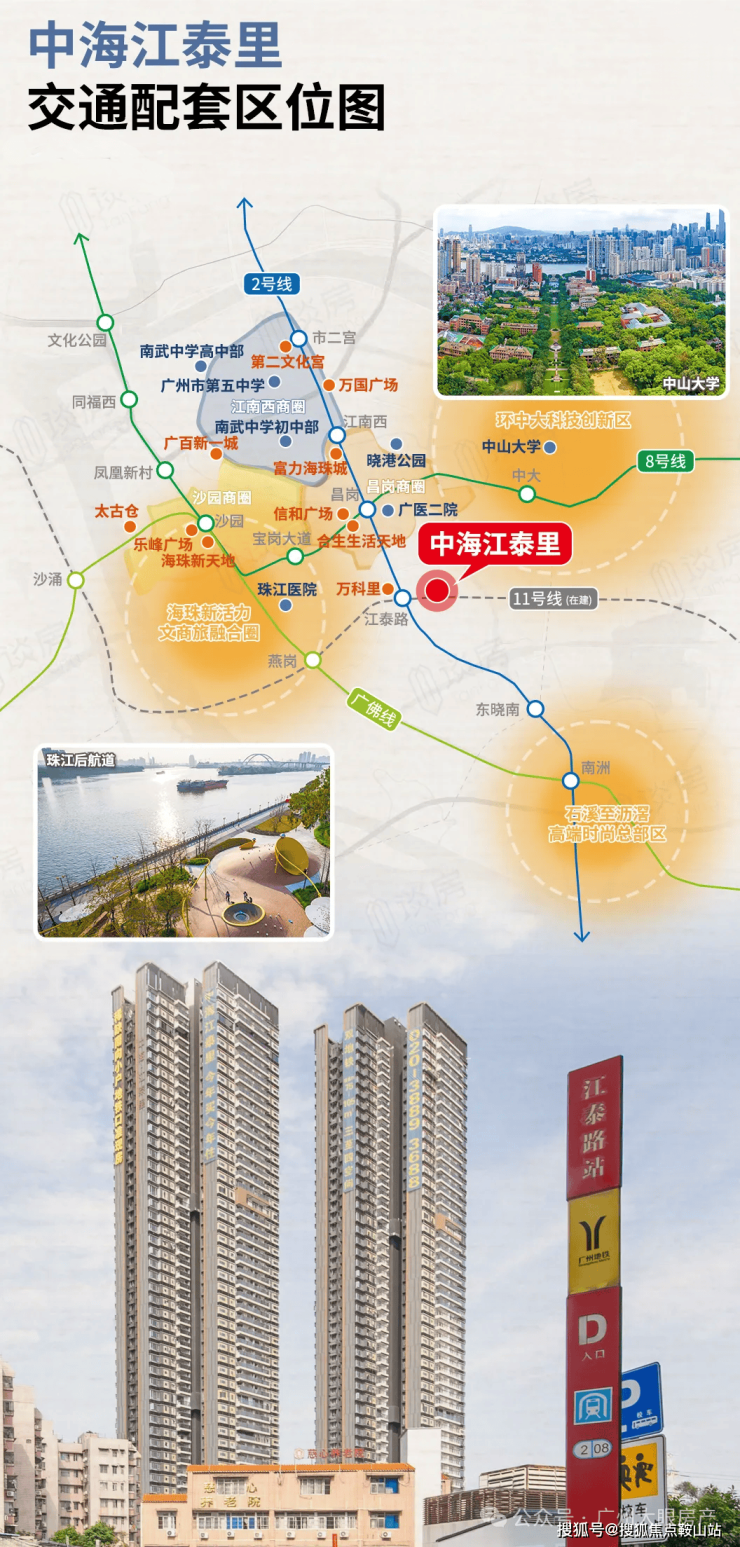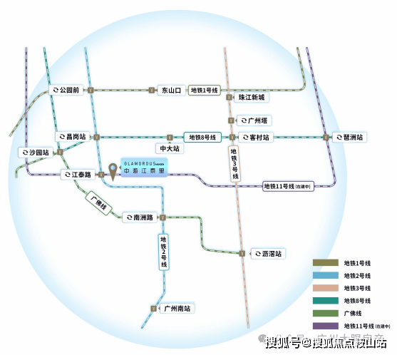 项目周边2公里范围内覆盖2号线、广佛线燕岗站、8号线昌岗站,经地铁出行可实现7站至南站、7站至琶洲,经换乘3号线、1号线、8号线,3站至中大、7站珠江新城、8站东山口