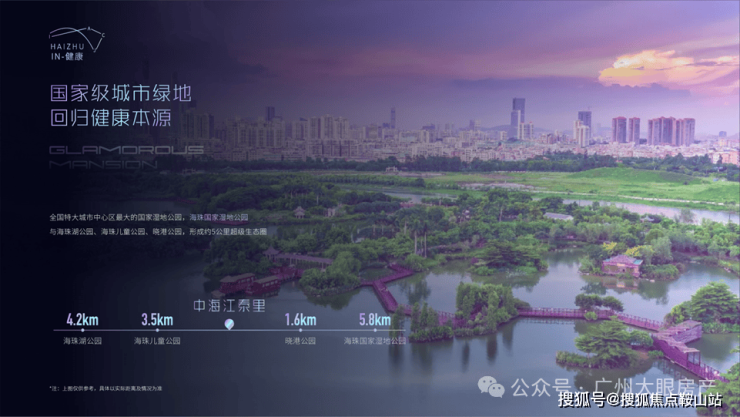 拥有国家级城市绿地自然资源:被全国特大城市中心区最大的国家湿地公园——海珠国家湿地公园,与海珠湖公园、海珠儿童公园、晓港公园,拥有5公里的超级生态圈。