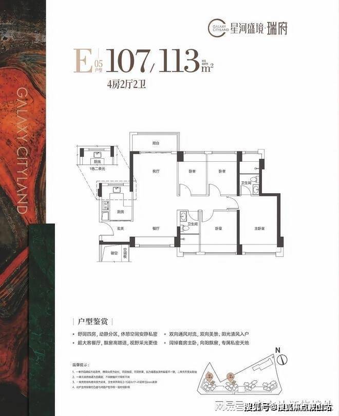 107-113㎡的 4 房 2 厅 2 卫,设计的是竖厅南北通透格局,全屋 8 面飘窗,四开间朝南,得房率约 95%(含赠送),阳台主朝西北向。
