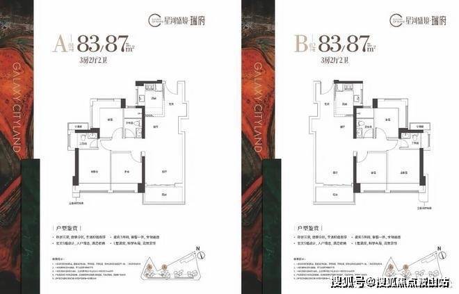 83-87㎡的 3 房 2 厅 2 卫,设计的是经典竖厅格局,三开间朝南,3 个卧室,得房率约 95%(含赠送),西南朝向。
