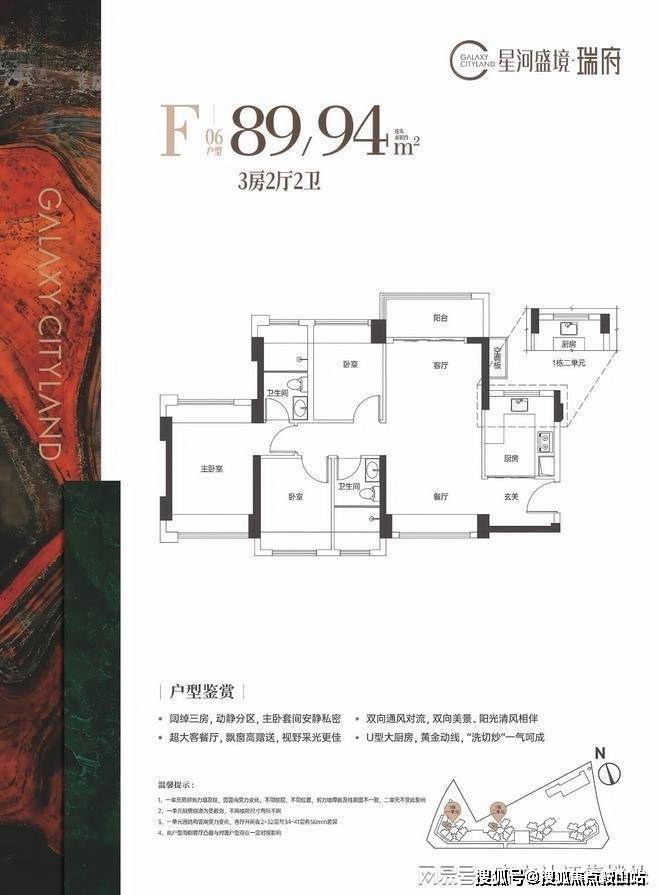 89-94㎡的 3 房 2 厅 2 卫,06 户型,设计的是横厅南北通透格局,进门入户玄关,全屋 8 面飘窗,四开间朝南,主卧南北通套房,3 个卧室,得房率约 95%(含赠送),阳台主朝东北向。