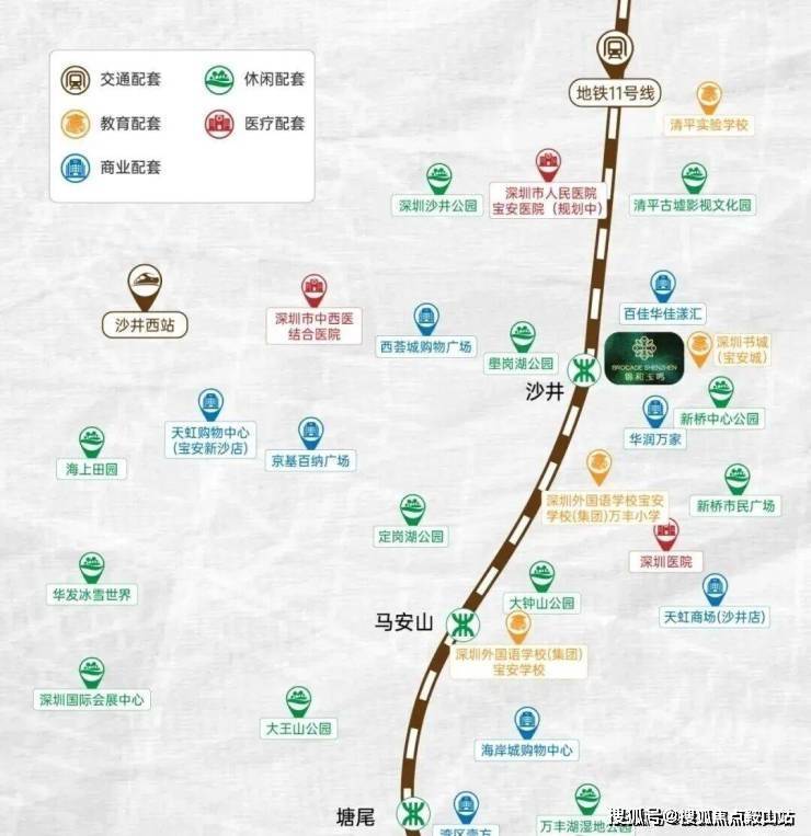 交通配套:锦和玉鸣府距离地铁11号线沙井站C、D出口仅约400米,步行约7分钟可达。从沙井站出发,2站可到达机场东站换乘1号线,8站到宝中,10站到前海,15站到南山高新园,通勤效率极高。
