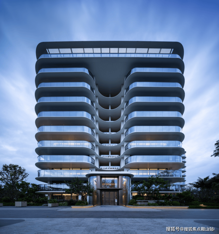 1.以三亚海岸为灵感,区别于常见的同质化/复制化设计,采用类公建化建筑形式区别于传统立面造型,以白色与灰色为主色系,通过铝板与玻璃所呈现的横向柔美线条,铝板层间线条采用创新弧形,紧扣“云端”与“海洋”母题,让建筑呈现出“云上花园之居,水上漂浮之所"的海洋灵动感。
