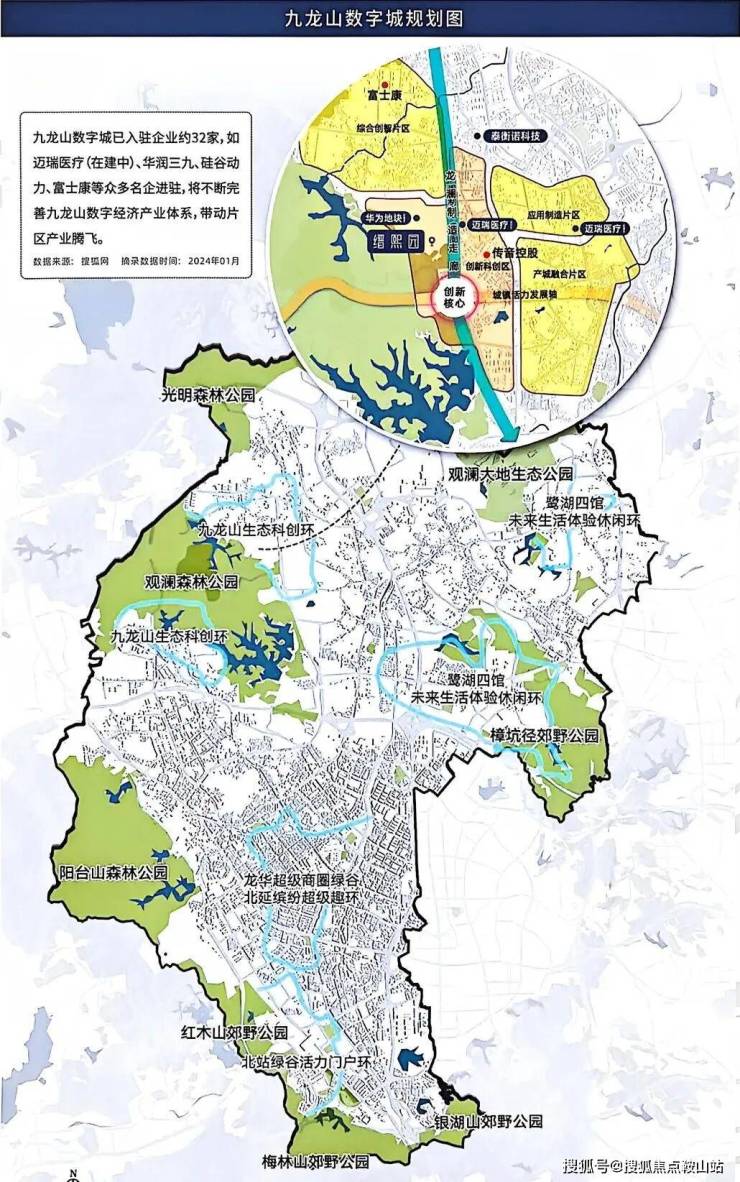 信城缙熙园这个盘,可以说直接“押宝”在了龙华未来发展的心脏地带——九龙山数字城。它离华为那么大一个基地,就隔了300米。