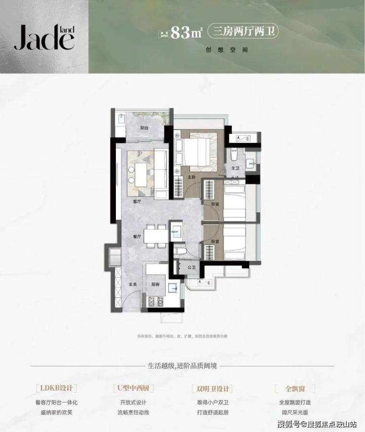 83㎡的3房2厅2卫,设计的是竖厅格局,进门入户玄关,客厅3.2米开间,LDKB一体化,S墙设计预留冰箱卡槽位,U型厨房,主卫少了淋浴,公卫三段式分离,得房率约90.33%(包含赠送),阳台西北朝向。