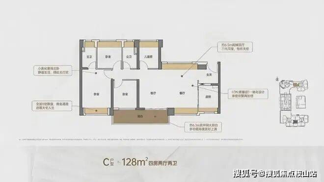竖厅格局,客厅3.5米开间,LDKB一体化,S墙设计预留冰箱卡槽位,客厅连接次卧出5.9米长的大阳台,主卧双面飘窗,次卧270°转角飘窗,全屋6面飘窗,U型厨房,卫生间干湿分离。