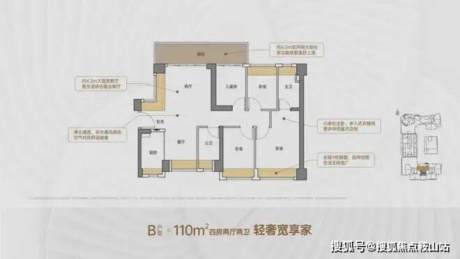 竖厅格局,客厅3.5米开间,LDKB一体化,S墙设计预留冰箱卡槽位,客厅连接次卧出5.9米长的大阳台,次卧270°转角飘窗,对比A1户型少一面飘窗,U型厨房,卫生间干湿分离。