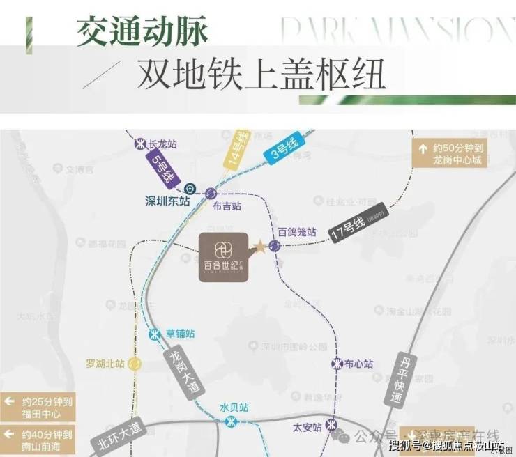百合世纪广场紧邻地铁5号线百鸽笼站(步行约100米),且未来规划有17号线罗岗站约450米在此交汇,形成双地铁上盖优势,通过地铁5号线,1站可换乘3/14号线,4站直达福田核心区,7站快速通达深圳北站,高效串联南山、前海等区域。