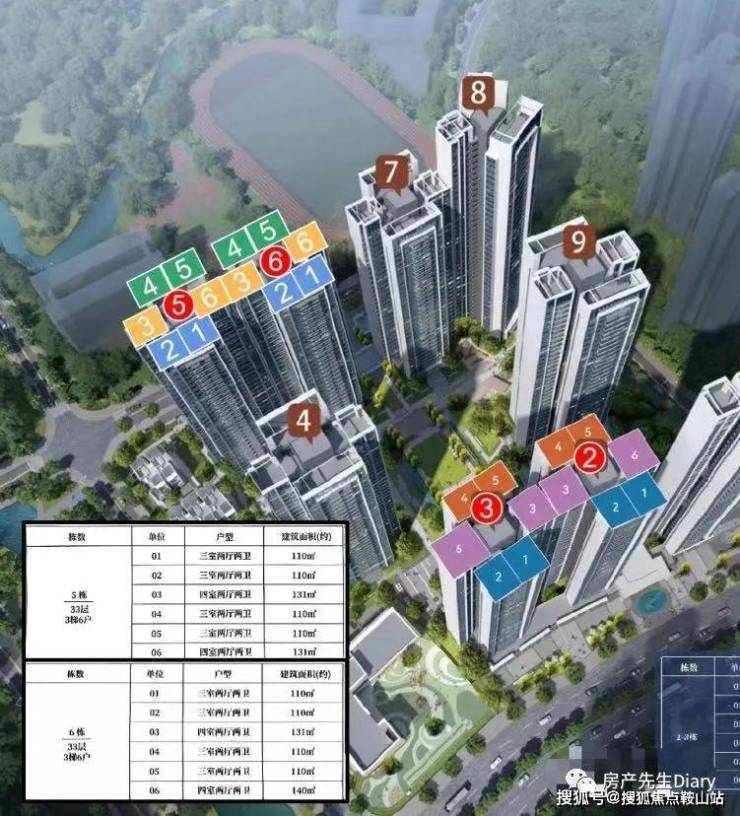 5、6号楼:33层,3梯6户,精装,明年年底交楼。南/北向110㎡、南北对流130㎡,单价约6.7万/㎡,总价分别是737-871万。