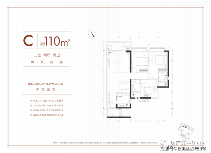 110平C户型,有入户花园,无生活阳台,厨房的操作台相对较大,不过采光较弱。