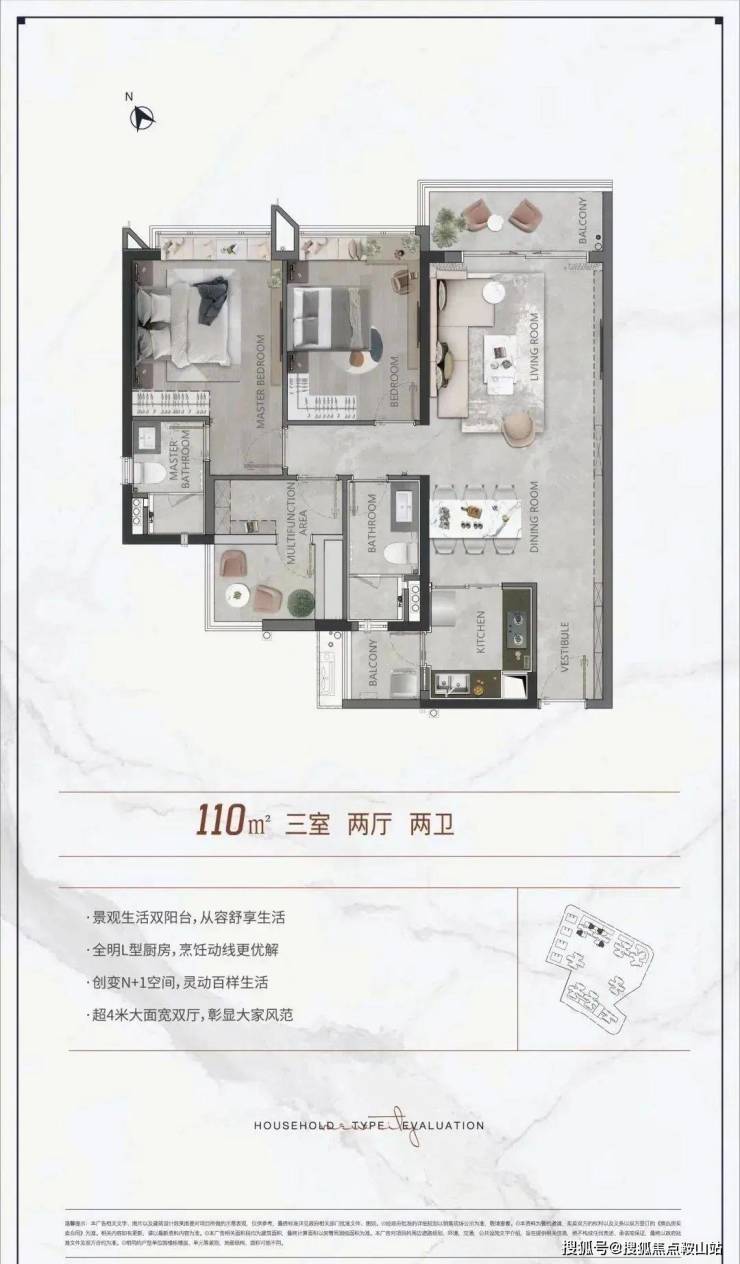 110平B户型,有生活阳台,无入户花园,厨房因连接生活阳台可操作空间减少,但采光相对较好。