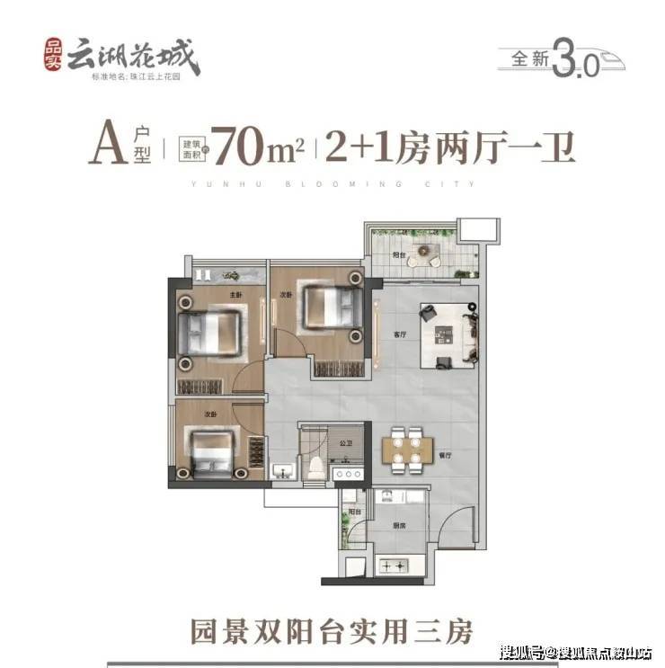 户型鉴赏:建面70平2+1房,全盘最小户型,做到了三房+双阳台,实用性拉满,82米景观园林,竖厅动静分离