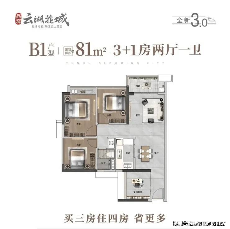 建面81平3+1房,客餐厅一体化,三分离式卫生间,三面采光