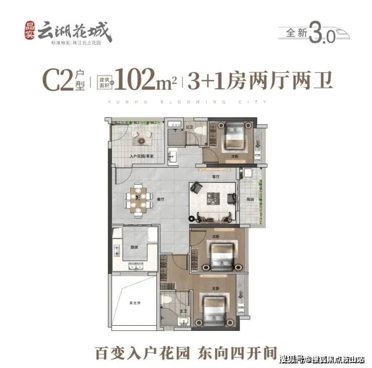 建面102平3+1房,入户即花园,东向四开间采光,U型厨房设计