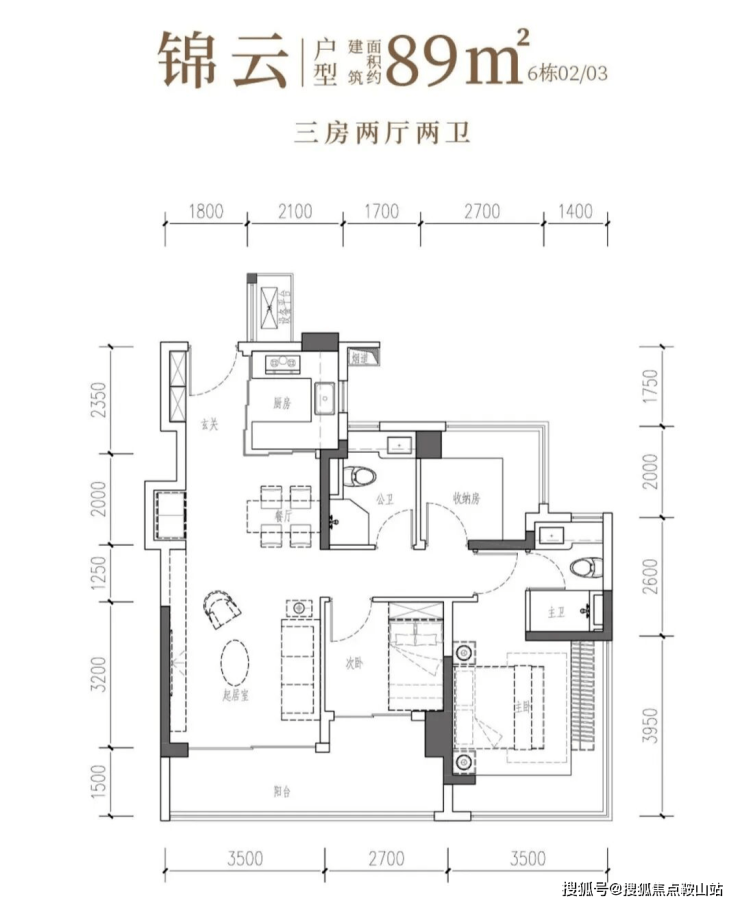 户型约88-107-130-139-178㎡的3-5房,标准层为2T3、2T5到2T6户。