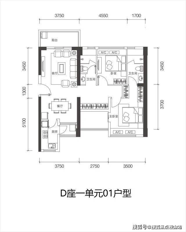 D栋一单元03户型:93㎡ 3房2厅2卫