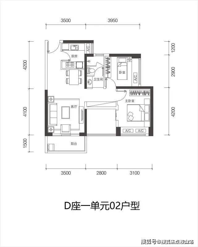 D栋一单元02户型:88㎡ 3房2厅1卫