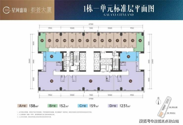 办公套数共454套,整层面积:约1381㎡,面积介于38-231㎡可灵动组合,