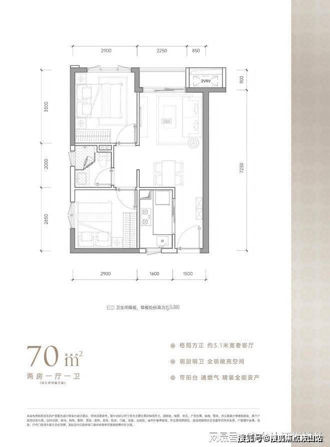 70㎡大两房(类住宅体验):标准竖厅,明厨明卫,双卧室面宽均超3米,主卧带独立卫浴,得房率约70%,阳台连通客厅,采光通风佳,可作为核心区住宅的“小户型平替”,适合追求居住品质的家庭。