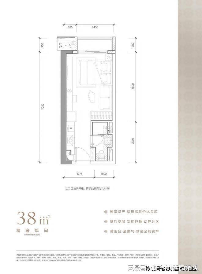 38㎡单房(小户型稀缺):麻雀虽小五脏俱全,带独立阳台、通燃气,卫浴干湿分离,得房率约69%