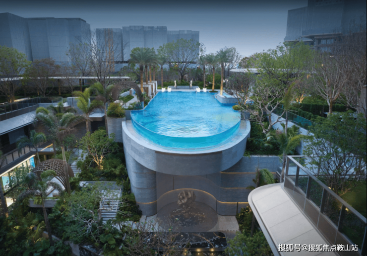 在下沉会所庭院,参考新加坡樟宜机场对于未来人居的极致场景,构筑约8.6M高巨幅垂直瀑布,与无边际泳池一起形成一道极致的瀑林景观,借助地形高差,打通上下立体空间,在台地花园平台上设置了极具艺术感的贝壳亭,打造多维立体的游赏体验。